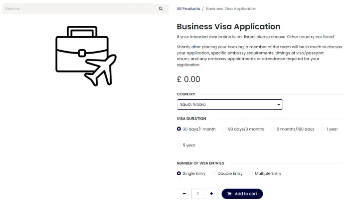For visa and passport bookings, please select the relevant product: tourist visa, business visa, or passport services. You will be able to select the country, length of stay and other options on the product page.